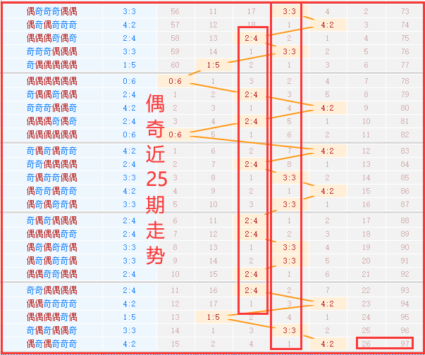 奇偶比开出0:6近30期遗漏15期,5:1遗漏26期,6:0遗漏97期未出。