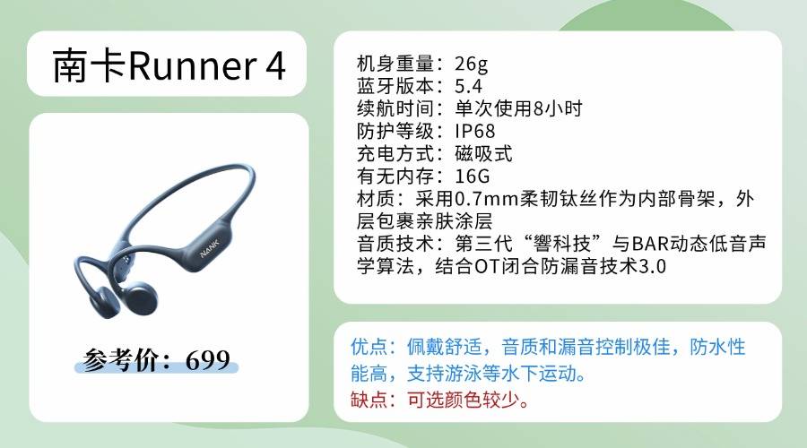 在骨传导领域扎根十余年的南卡,始终聚焦“听力健康+专业运动属性”的双重打磨,不仅稳稳占据行业头部位置,更拿下德国红点奖等国际权威认证。作为品牌旗下旗舰级运动耳机,Runner4在500-1000元价位段堪称“闭眼入的最优解”——仅699元的定价,却能提供媲美千元级产品的体验,在这个价格范围几乎找不到对手。