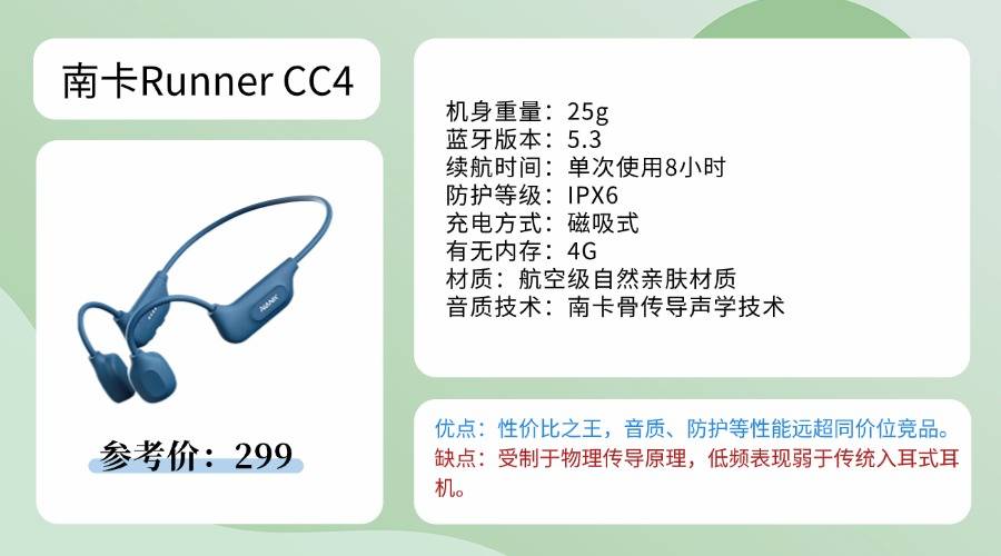 作为南卡深耕入门级市场的爆款产品,RunnerCC4堪称“骨传导入门必备的性价比之选”——不到三百元的价格,却成为预算有限时首次尝试骨传导耳机的最优解,完美平衡了产品品质与成本控制,上市后长期占据入门级骨传导耳机销量榜单前列。