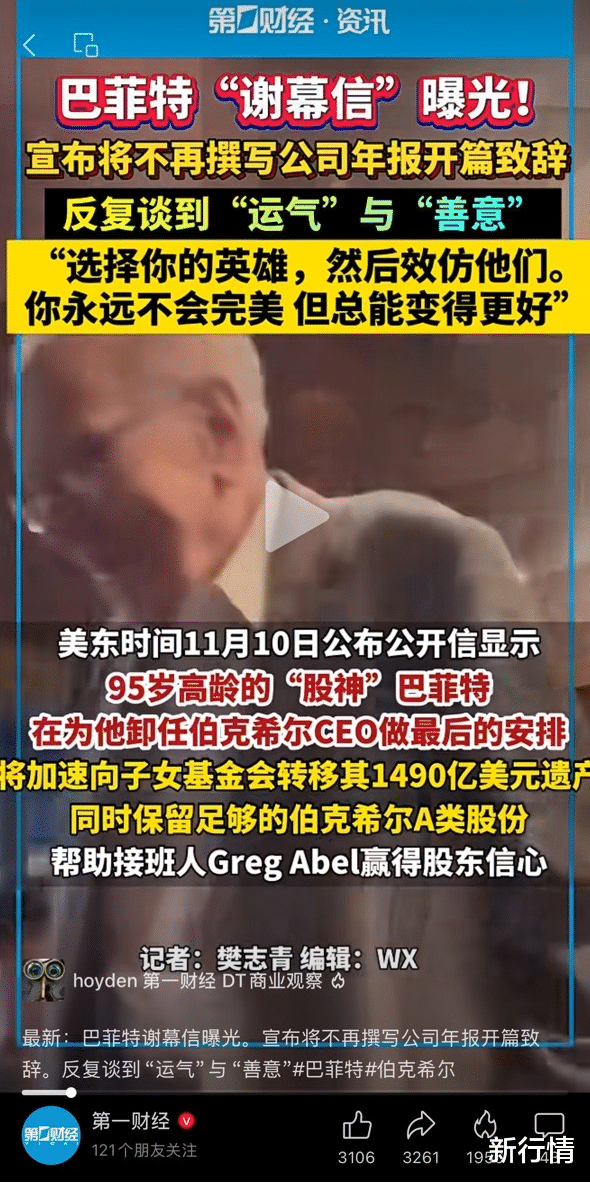 近日,95岁的巴菲特发布感恩节公开信,为卸任事宜作出最终安排。