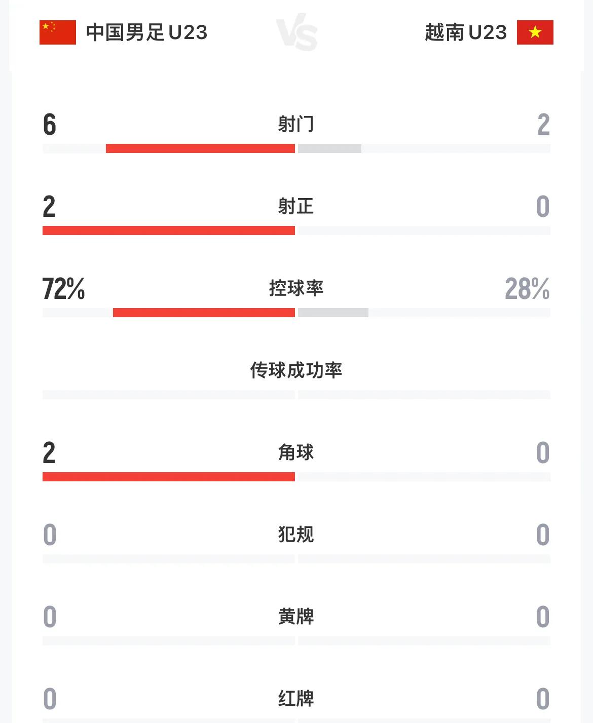 从半场的数据来看,我们明显占优。中国队6次射门2次射正1个进球,越南队只有两脚射门,没有射正,控球率中国队更是高达72%,对方只有28%。