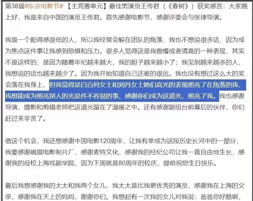获奖被质疑谁想到赞誉没来,而“风雨不断”,白百何含沙射影的六个字令王传君备受质疑。