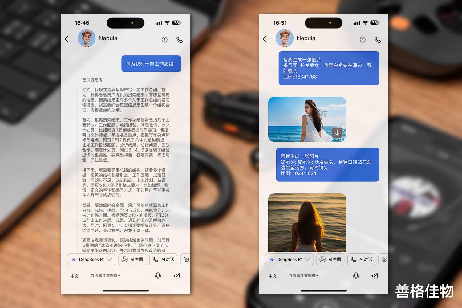 最后是AI功能,开石OpenRock S30的配套APP“NebulaBuds”中集成了豆包和DeepSeek R1两个大模型,具体用哪个根据自身习惯选择,常用的如AI对话、AI生图等这些功能都有,这一部分涉及的内容太广泛了,就不细说了,建议还没有接触AI的同学认真研究一下,作为一名合格的牛马,熟练掌握AI,才能跑得更快、走得更远。