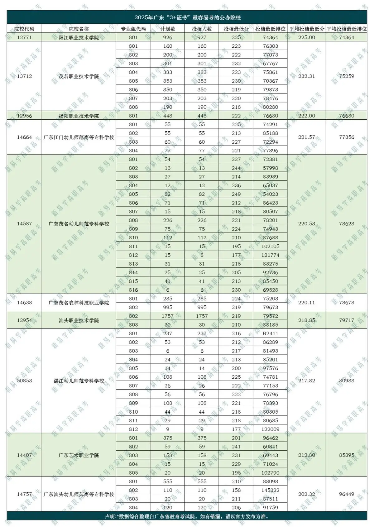 2025年公办分数较低的10院校,分别是阳江职业技术学院、茂名职业技术学院、揭阳职业技术学院、广东江门幼儿师范高等专科学校、广东茂名幼儿师范专科学校、广东茂名农林科技职业学院、汕头职业技术学院、湛江幼儿师范专科学校、广东艺术职业学院、广东汕头幼儿师范高等专科学校。