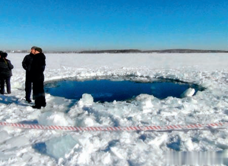 陨石坠入冰冻的切巴尔库尔湖中形成的窟窿