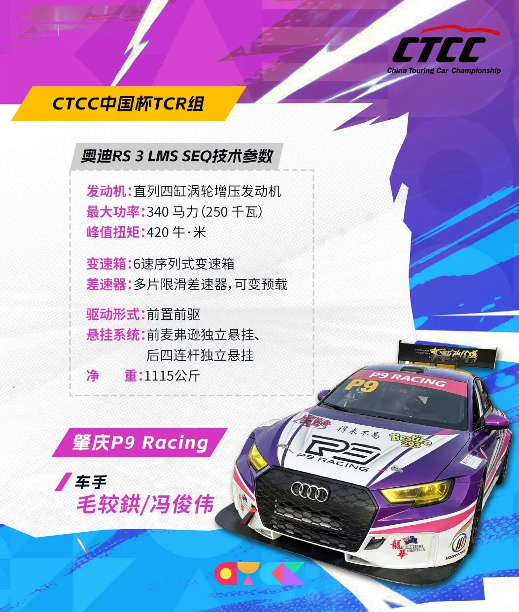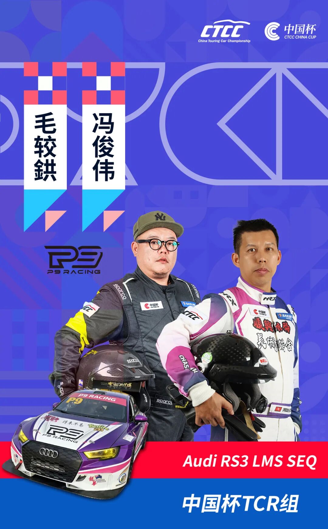 肇庆P9 Racing派出毛较鉷与冯俊伟两位车手出战。毛较鉷是CTCC中国杯TC2组分站冠军车手,在华南地区赛事积累了丰富经验;冯俊伟同样活跃于华南地区赛事,近两个赛季已在CTCC积累了国家级赛事的实战经验。两位车手风格稳健,目标清晰:在本赛季提升对TCR组别车辆的默契度,展望未来能够踏上更高级别的TCR系列赛。