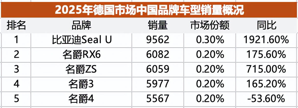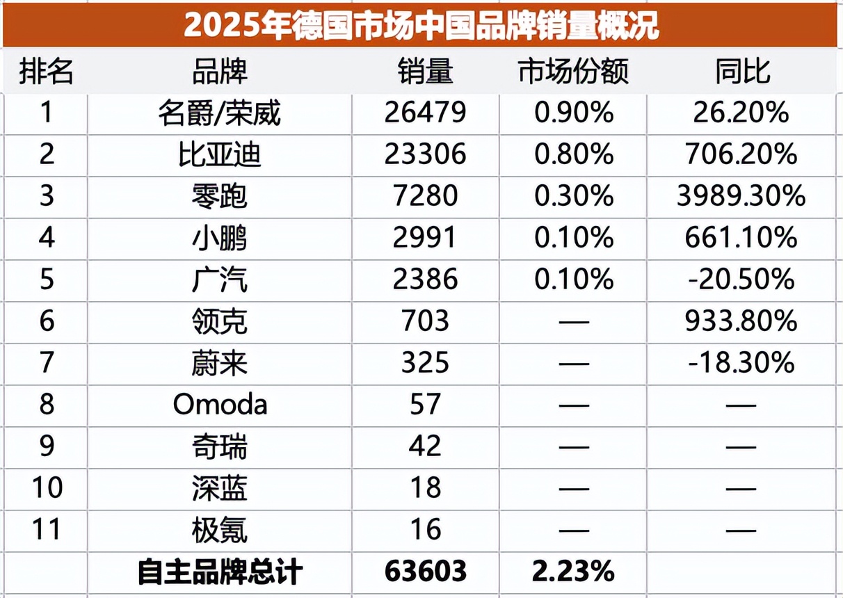 中国品牌2025年在德国市场的总销量6.36万辆,在德国市场仅占2.23%的份额,销量最高的是上汽旗下的荣威/名爵,全年总销量2.65万辆,同比增长了26.2%。