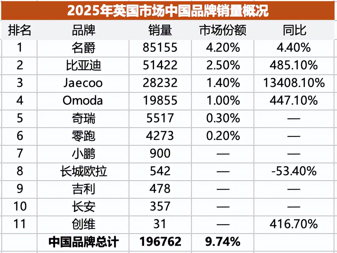 在如此繁重的税率之下,中国品牌2025年在欧洲市场的总体销量达到73.4万辆,占据5.5%的市场份额,且在榜的绝大多数品牌,都实现了两位数、三位数甚至四位数的同比增幅。