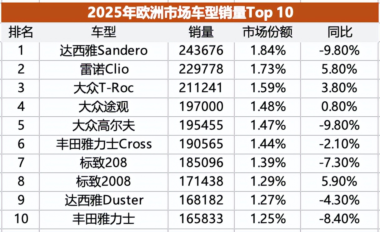 车型方面,2025年欧洲市场有3款车型销量超过20万辆,分别是达西雅Sandero、雷诺Clio和大众T-Roc,都是尺寸较紧凑的两厢车或SUV。整个Top 10畅销车型中,尺寸最大的是排名第四的大众途观。