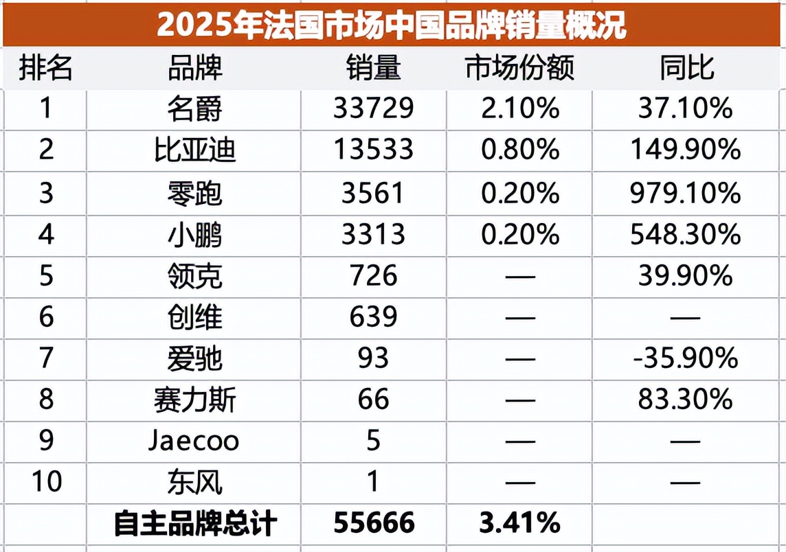 在法国市场,中国品牌2025年总销量达到5.57万辆,占据当地3.4%市场份额,略高于在德国市场的份额,但依然明显低于欧洲平均。