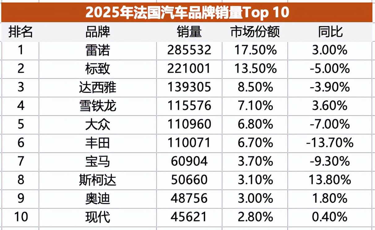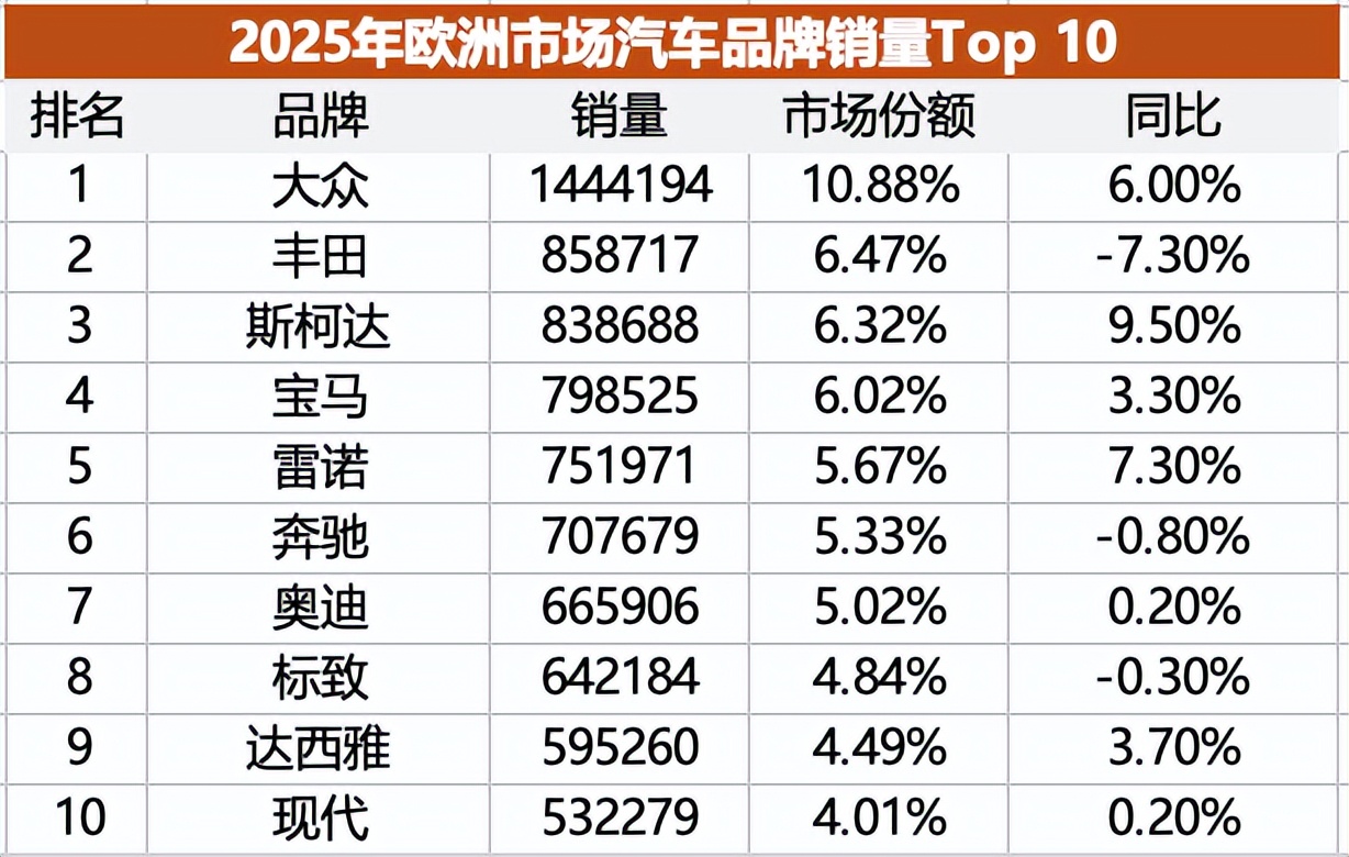 欧洲市场销量最高的10个品牌中,有8个都是欧洲本土品牌,唯二挤入前十的外来品牌分别是排名第二的丰田和排名第十的现代。