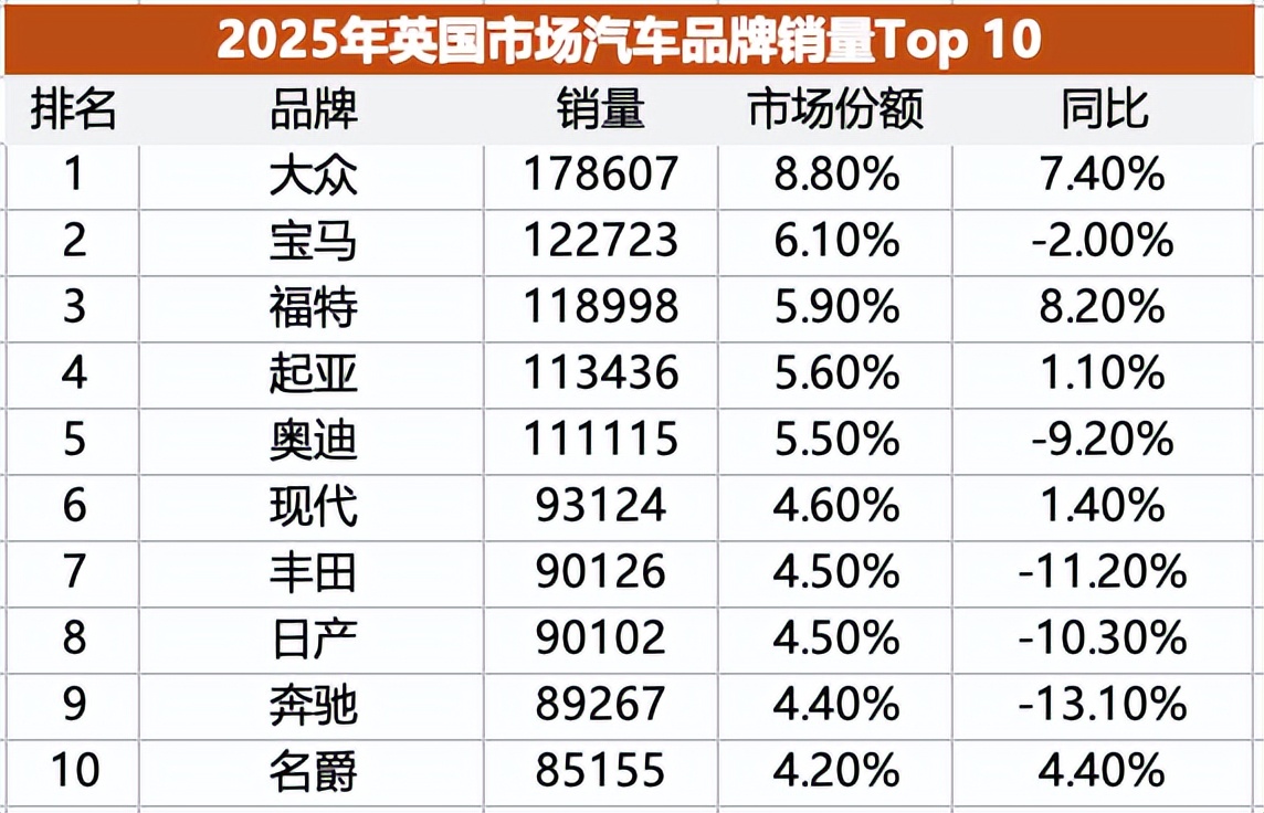 04英国市场2025年英国新车销量202.1万辆,同比增长3.5%,是其2019年之后首次重新超越200万辆。
