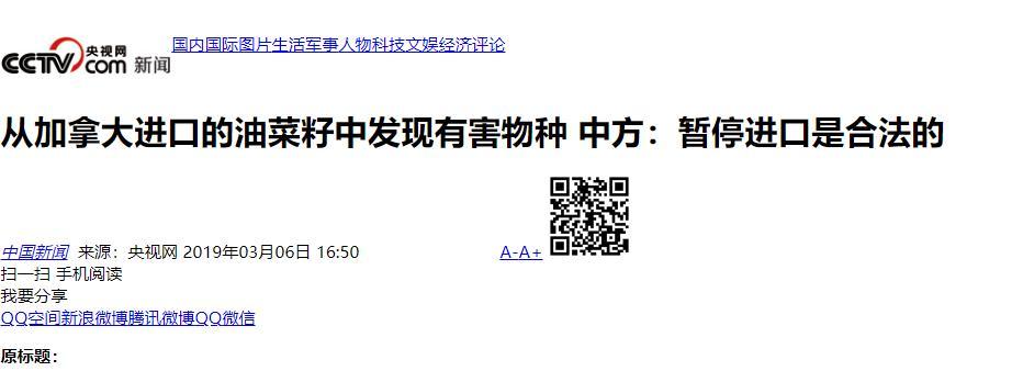 2019年年初,中国海关总署连续四次给加拿大方面发通知,说从他们那儿进口的油菜籽里,检测出了检疫性有害生物。