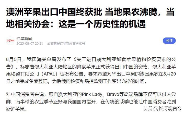 直到去年,澳大利亚总理阿尔巴尼斯访华,两国领导人见证签署了一系列合作文件,其中就包括澳大利亚鲜食苹果输华的检疫要求议定书。