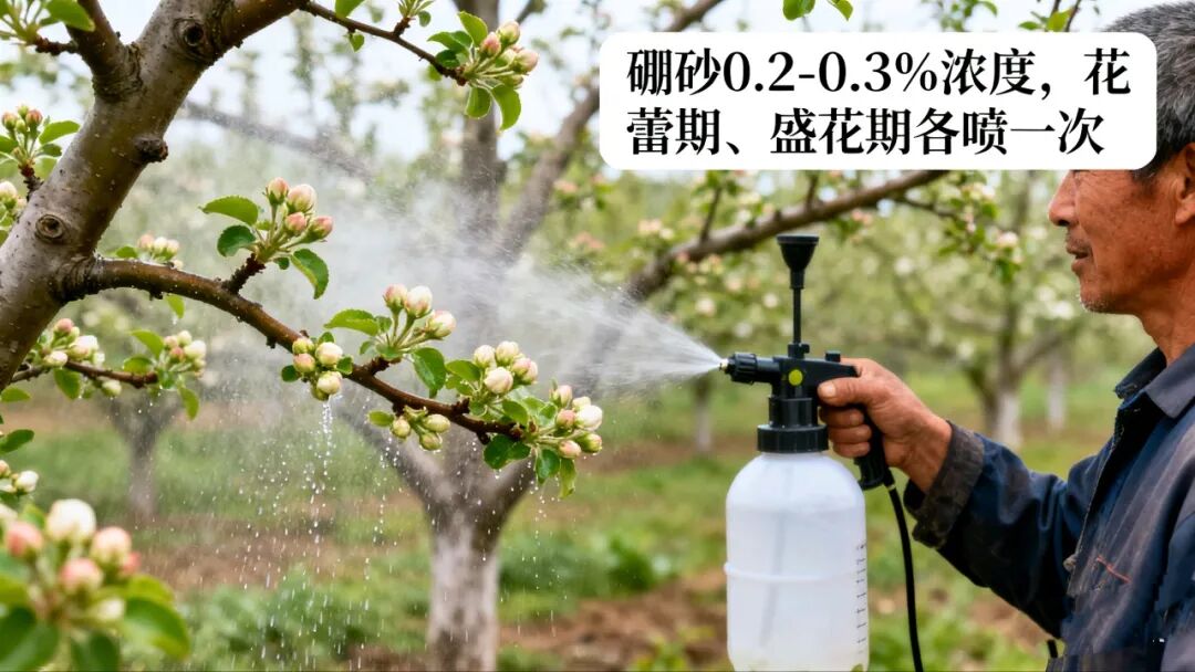 追肥的情况,果树追施硼肥主要以喷施的方式为主。使用硼砂的情况一般浓度控制在0.2-0.3%、硼酸0.1-0.2%稀释浓度即可。苹果树在花蕾期和盛花期各喷一次即可,大部分果树都是在这个两个生长期喷。