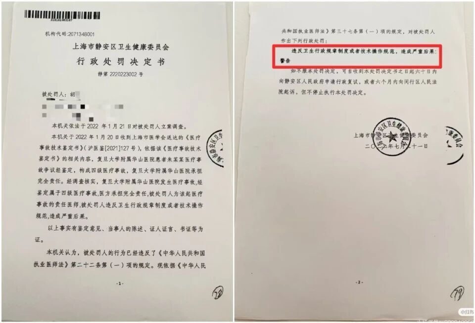 朱女士介绍,医疗事故鉴定结果做出后,2022年7月,静安区卫生健康委曾对涉事医生做出行政处罚。