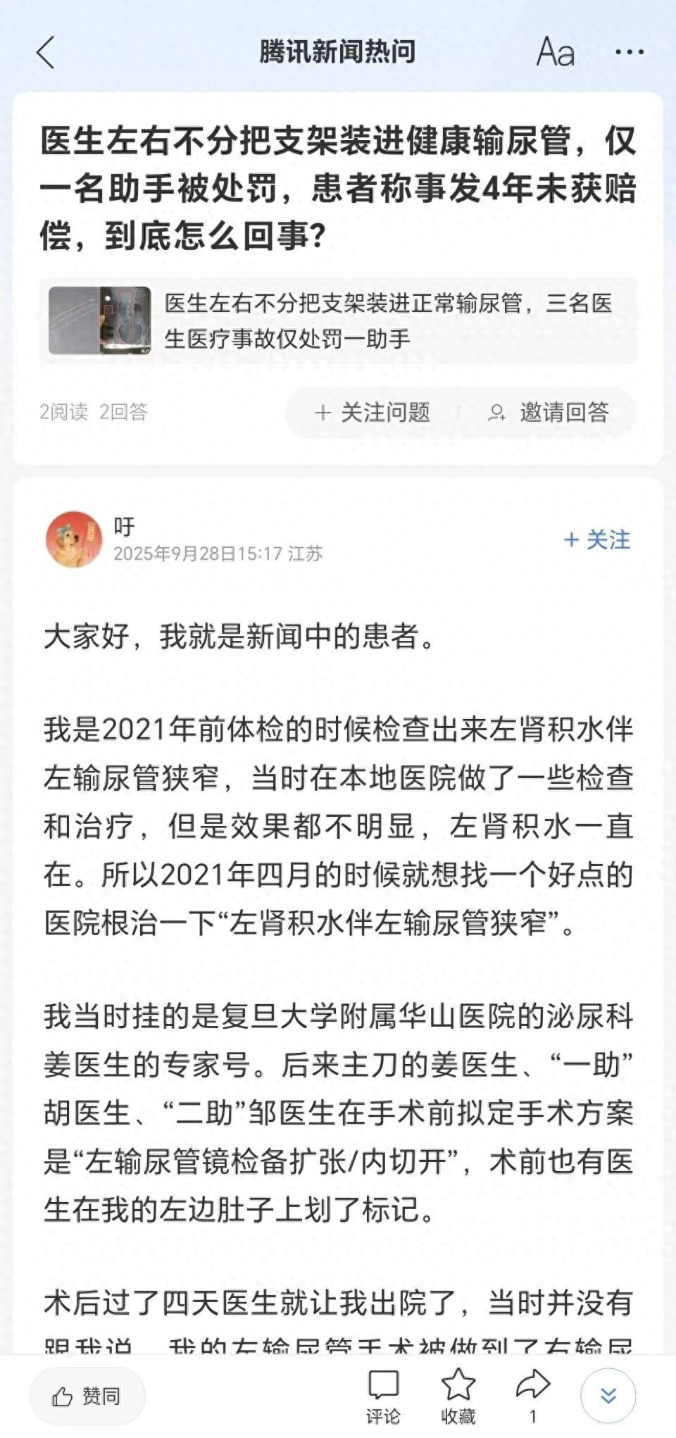 经过4年维权,近期法院判决医院赔偿朱女士5.4万元。她向华商报大风新闻记者表示,受处理的仅是一位当时手术资质不够的助手,而自己慕名挂号的专家、主刀医生却没受到处罚。日前,朱女士在腾讯热问发声并寻求帮助。