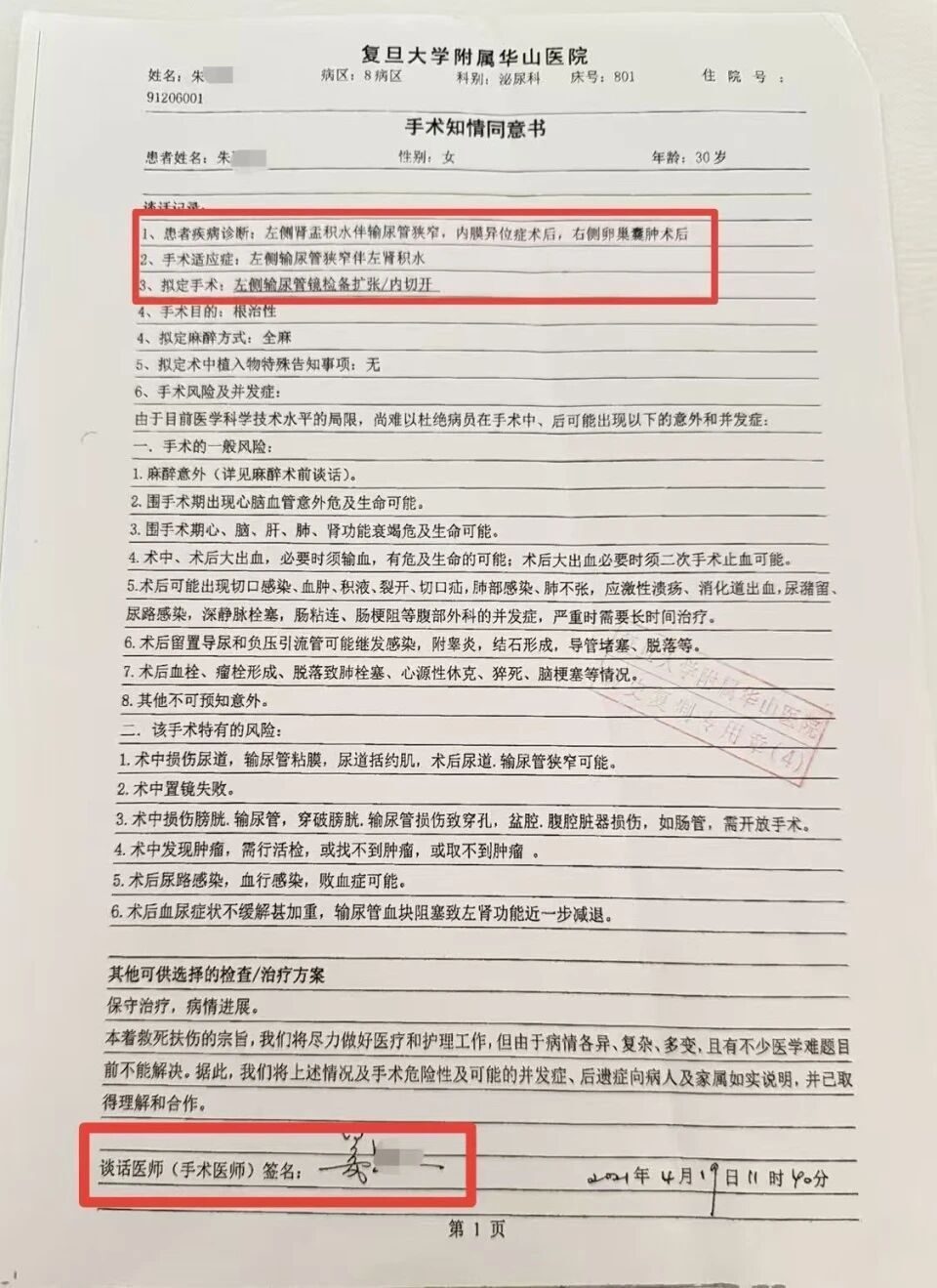 “医生为我确定了左输尿管手术方案,包括术前谈话以及手术知情同意书上,主刀医生也都是这位医生。2021年4月21日下午手术顺利进行,不久后出院。”朱女士说,直到术后两个月,她到医院复查拍CT后才发现,自己原本健康的右输尿管内被施行了手术,患病的左输尿管反而没有手术。