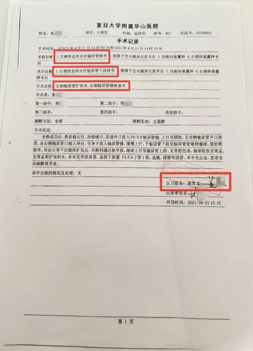 “我是在2021年体检时检查出左肾积水伴左输尿管狭窄的,当时也曾在我们盐城的医院做过一些治疗,但效果不是很好,就考虑到上海找权威一点的医生好好治疗一下。”朱女士介绍,2021年4月,她挂了复旦大学附属华山医院泌尿科一名主任医师的专家号,并在随后住进该院。