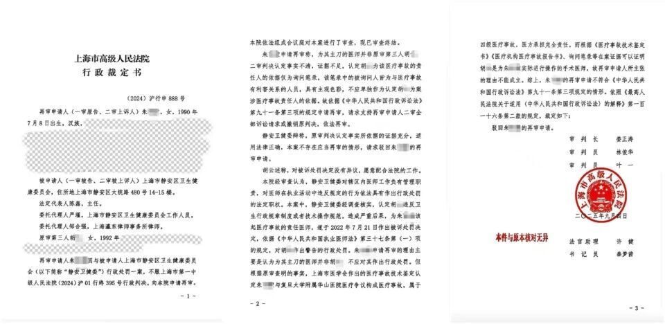 朱女士不服卫生健康委处罚,向当地法院提起行政诉讼,要求撤销相关处罚决定,对主刀医生做出处罚。但三级法院均认为,根据《医疗事故技术鉴定书》《医疗机构医疗事故报告书》、询问笔录等在案证据可以证明第一助手胡某是为朱女士实际进行操作的手术医师,故再审申请人所主张的理由不能成立,并先后做出驳回朱女士诉求的裁定。