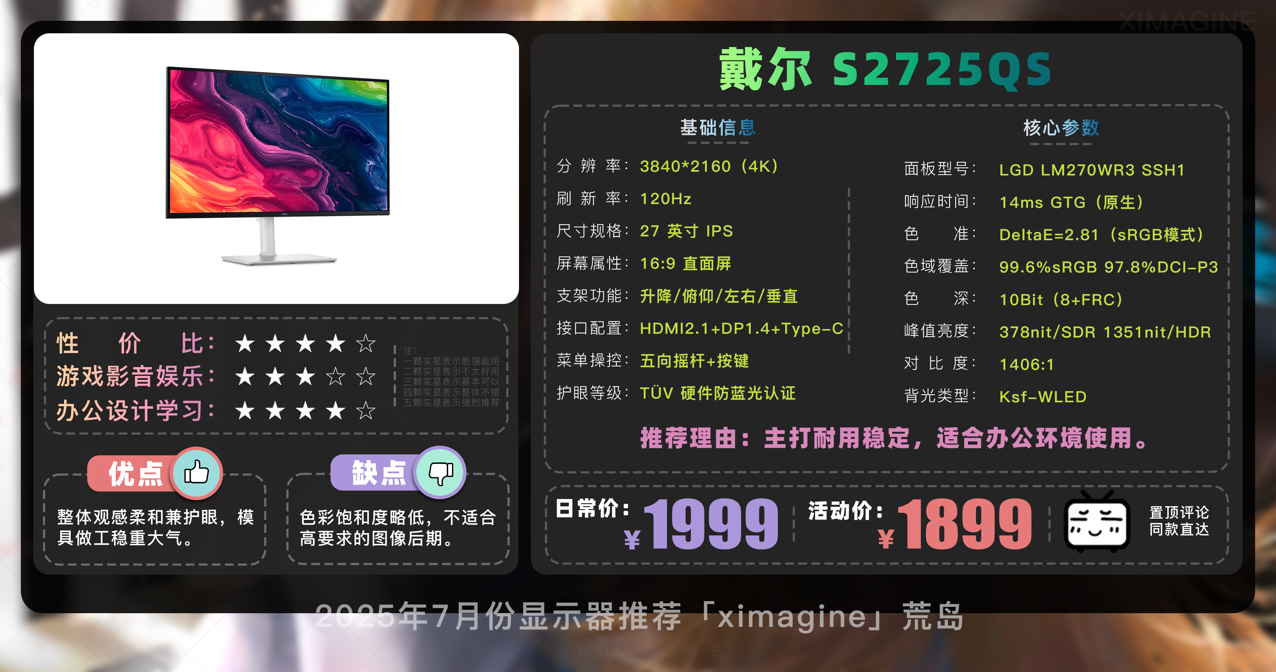 戴尔 S2725QS,采用LGD WR3-SSH1 面板,27寸4K 120Hz高刷 IPS 屏,作为一款办公屏,给我的感受是稳定可靠,兼顾休闲游戏。放在公司的工位上,日常的文档处理和视频会议都非常清晰高效。下班后玩一些星露谷物语这类休闲游戏,画面精美,色彩也很自然。戴尔一贯的稳定性和品控,让我在长时间使用时也感到舒适。当前活动价 1899 元,就像一位稳重的同事,既能出色完成工作,也能在你需要放松时提供一份闲适的乐趣。