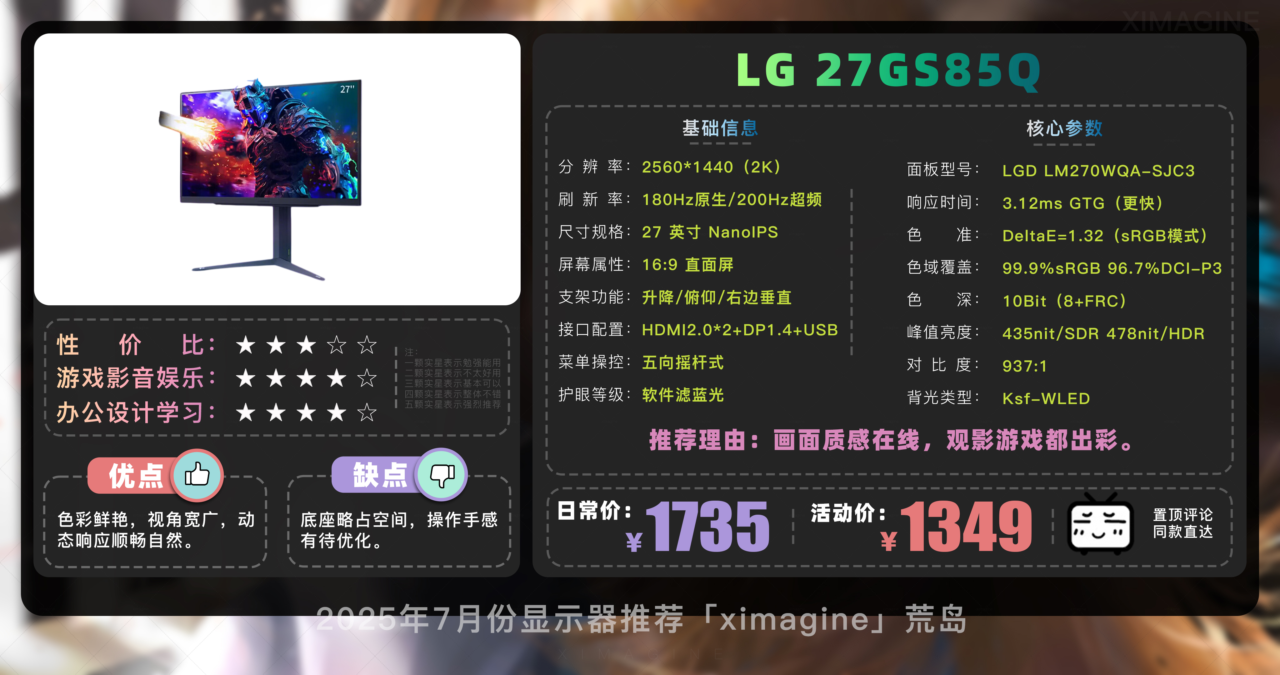 以上就是本期25年7月显示器推荐清单,从入门性价比之选,到顶级旗舰体验,再到办公设计兼顾的全能选手,希望能帮你少走弯路,精准找到你的梦中情屏,如果有心水的型号,可在置顶评论区直达!记住选购显示器最重要的是匹配你的实际需求和预算,本期就到这,如果觉得内容对你有所帮助,请三连支持!我是「ximagine」下期再会!