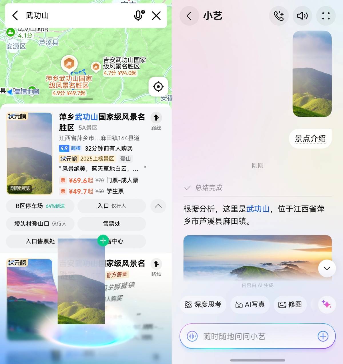 除了工作时的生产力需求,统一拖拽在生活里也很好用。比如有次周末计划短途游,我在鸿蒙版高德地图里刷到了超心动的武功山打卡点,长按图片拖拽给小艺,它立刻就给我推荐了相关的提问建议,比如“景点介绍”“这是哪里?”,点击对应问题就能快速得到详细答案,做攻略的效率直接翻倍。