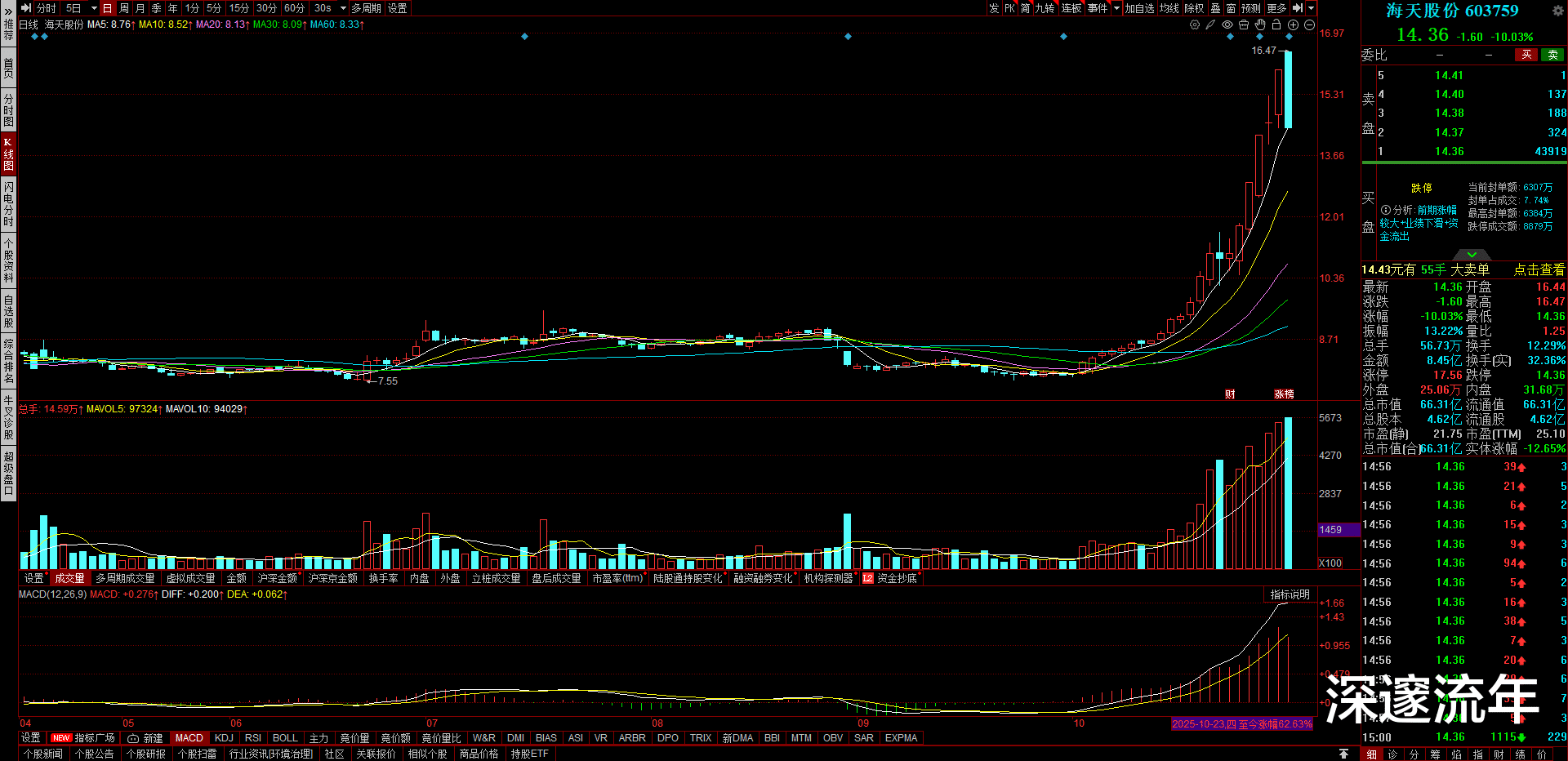 海天股份开盘即上演惊心动魄的过山车行情,早盘高开至 16 元后急速跳水,一小时即封死跌停板,追涨资金单日浮亏超 13%。