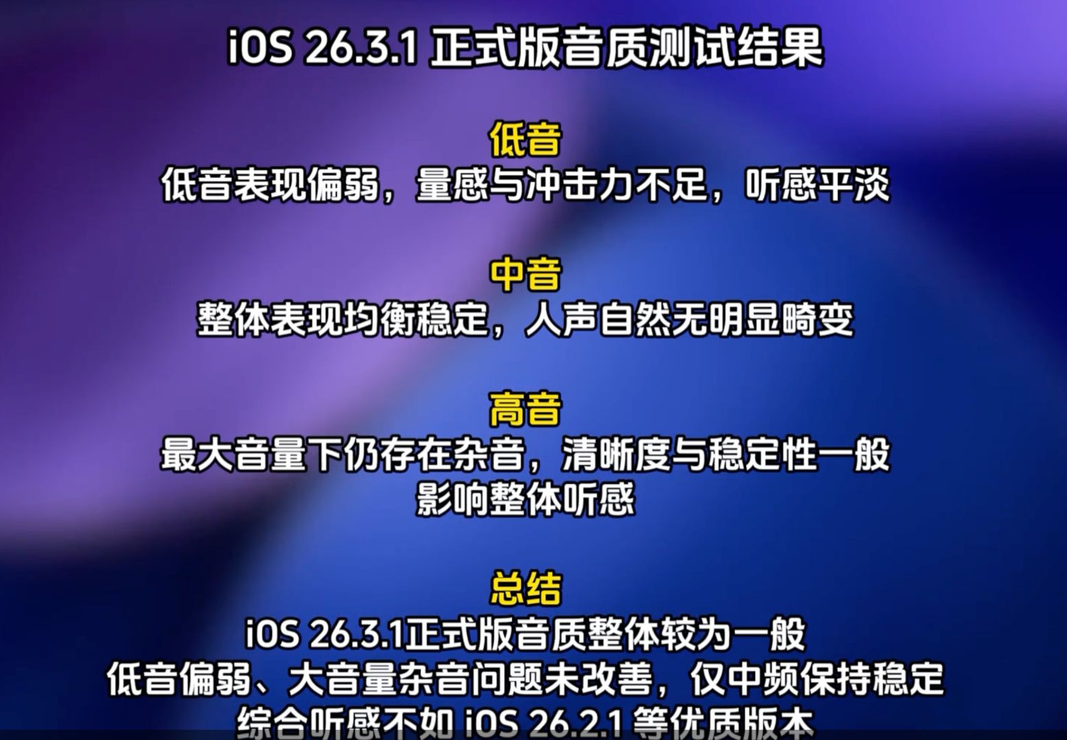 对比上一个子版本iOS 26.2.1,新系统的外放表现简直一言难尽。低频部分明显变得疲软单薄,失去了原有的下潜质感;