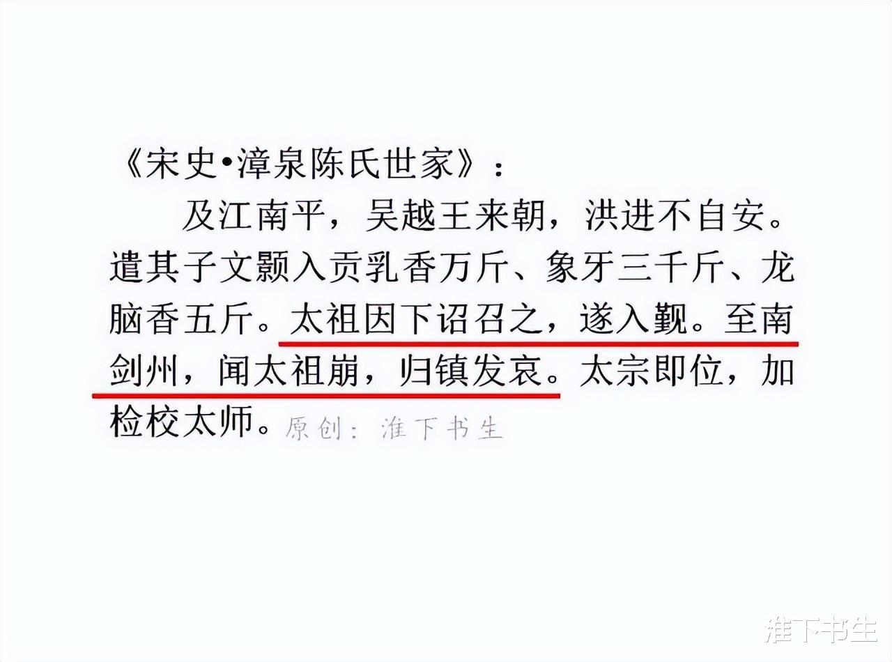清源军陈洪进在赵大死前就入朝了,只是走到半路赵大突然驾崩了,才临时“归镇发哀”的!后来吴越国的纳土归宋,一定程度上也是受到了陈洪进率先纳土归宋的压力和影响。