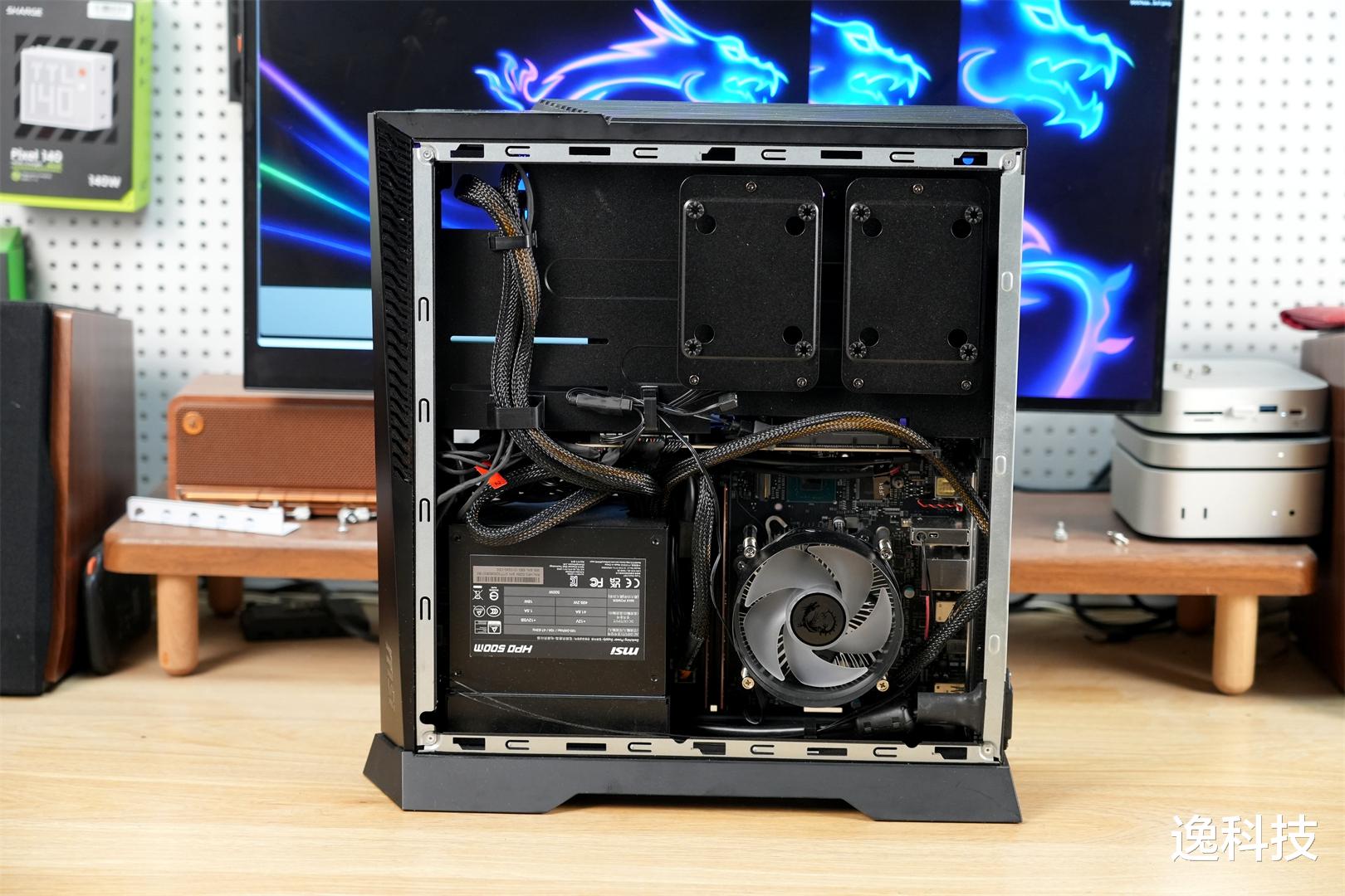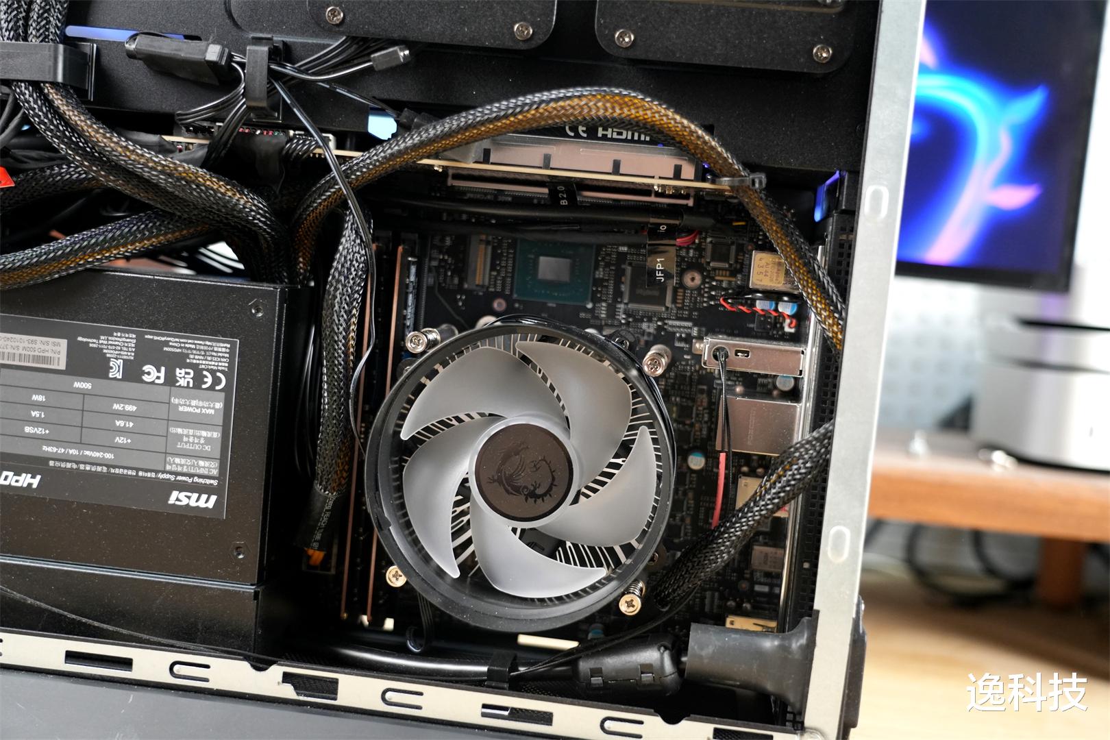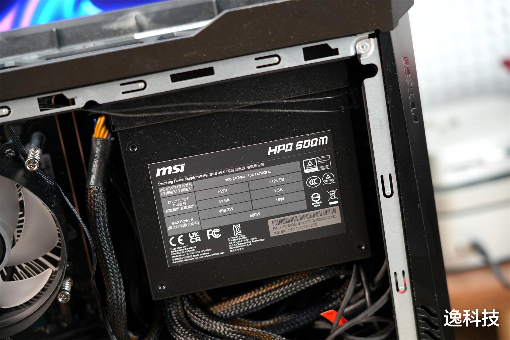 该主机所配备的电源为微星 HPD 500M 规格产品。它采用线材直出的设计方式。在散热方面,电源采用向下排风的设计,与下压式的 CPU 散热器形成截然不同的出风路径,热量分别从机箱下方和尾部排出,确保散热效果更佳。