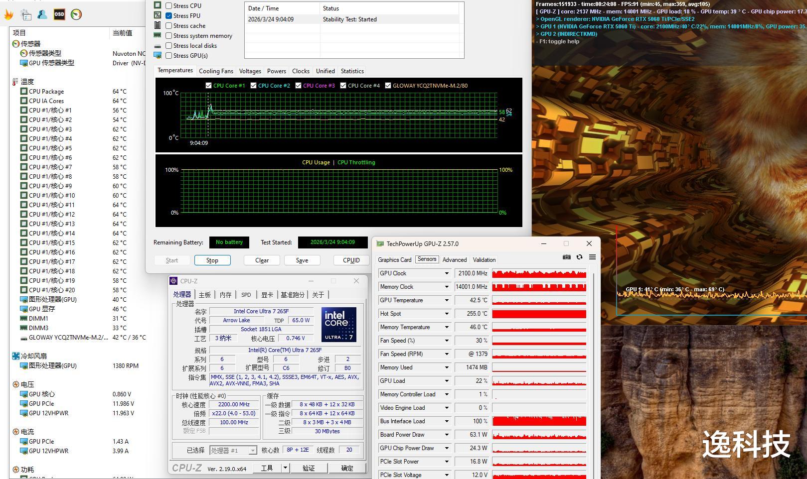 双烤压力测试。测试结果显示,当 CPU 处于高负载烤机状态时,其温度仅仅达到 64℃,与此同时,显卡的温度也仅为 69℃,功耗稳定保持在 63W。就这套配置在满载运行的情况而言,温度控制堪称卓越。不得不说,如此出色的温度表现,机箱合理的风道设计功不可没。