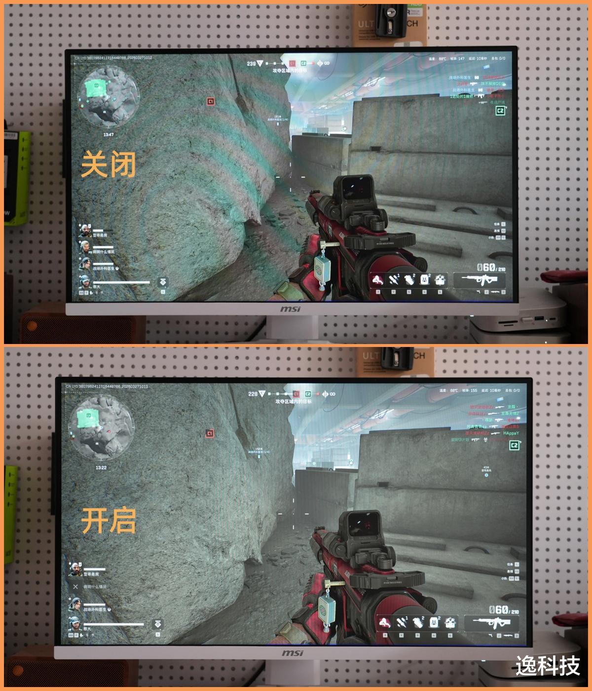 微星MAG 274QRFW X32白刃新增AI视觉功能。对比游戏画面可见,开启该功能后,画面整体亮度与饱和度获智能优化,暗部细节清晰可辨。
