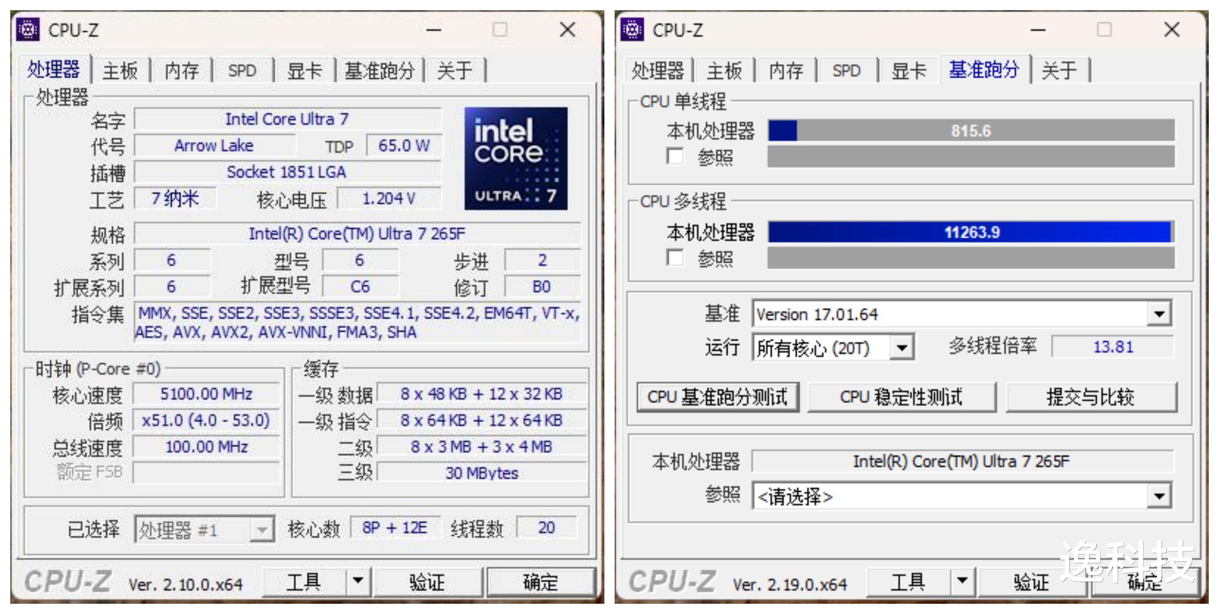 CPU-Z测试,单核815.6分,多核11263.9分。
