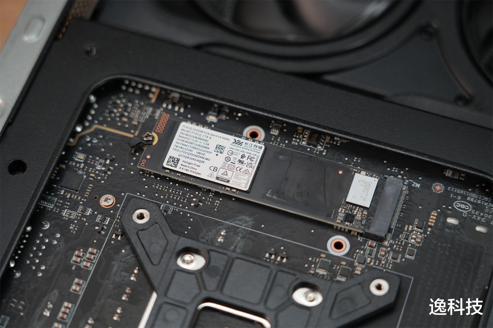 主 SSD 被安置在主板背面,预先安装的是长江存储 1TB 的 SSD,还配备了导热垫,该导热垫可将热量传导至机箱侧板,从而实现对存储温度的有效管控。