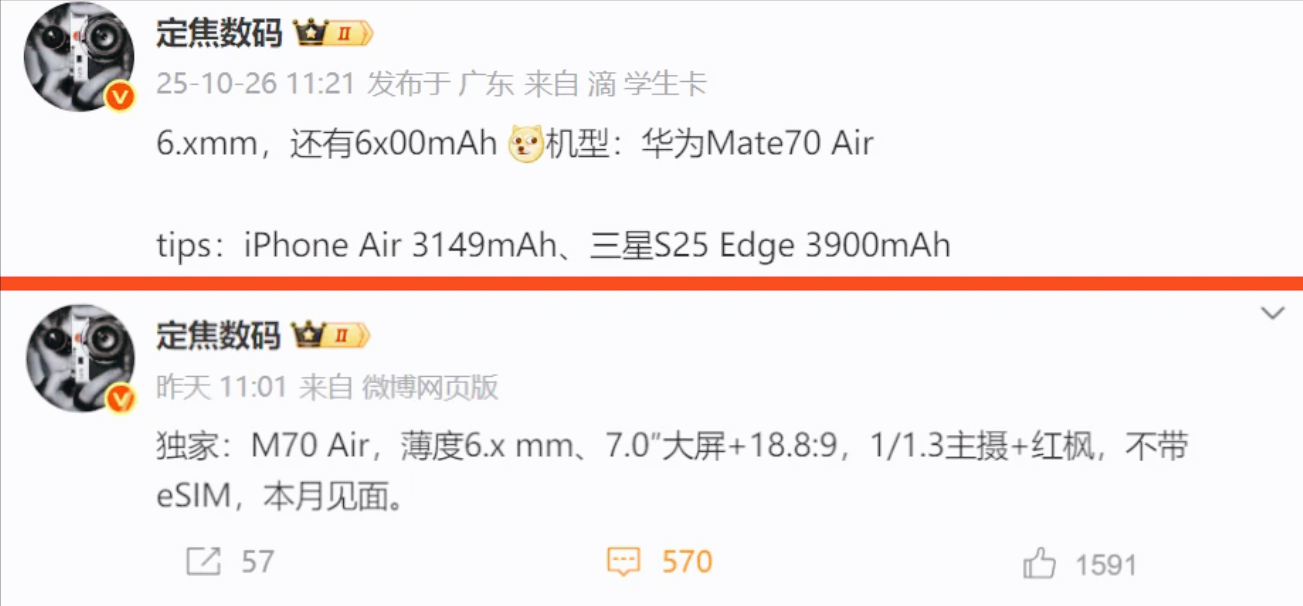 又爆大料了,华为Mate70 Air又有了新进展。它不仅正式出现在电信终端产品库中(型号SUP-AL90),连核心配置也被业内博主再度确认。