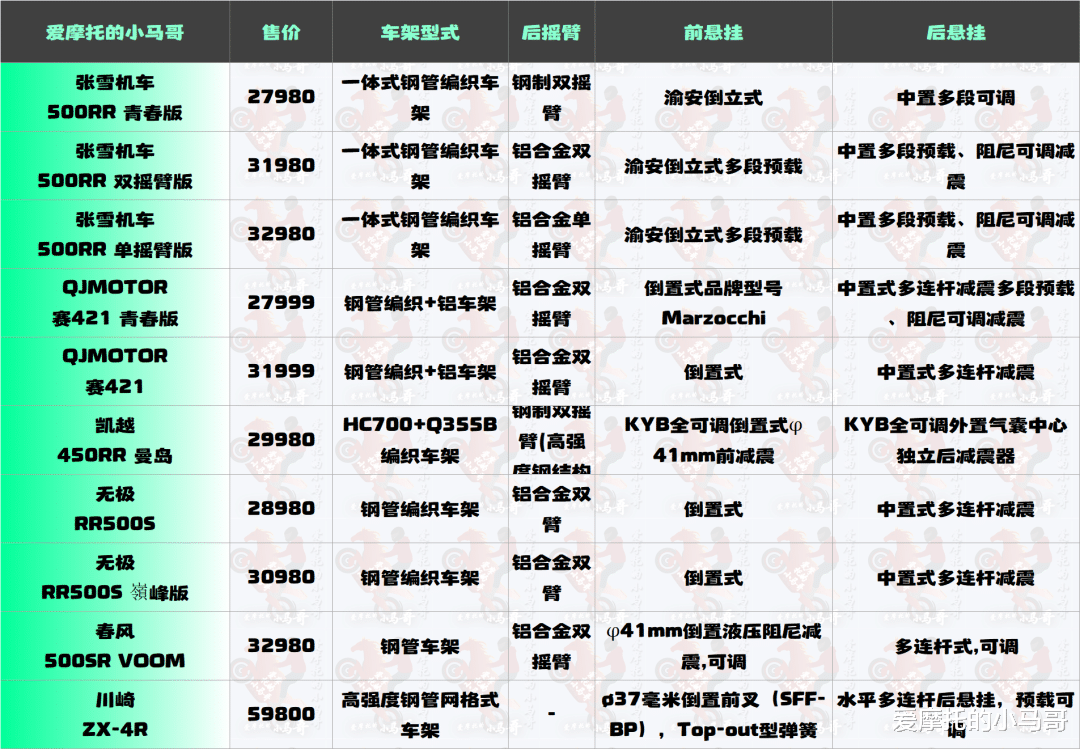 还蛮多的,无极、春风、钱江、凯越以及川崎都有排量差不多的四缸平台,至于价格除了川崎以外,其他五款国产车型其实都在3万左右,没啥太大差别。至于外观嘛~各有各的特色,张雪能称得上是出彩的设计也就是这个单摇臂了。