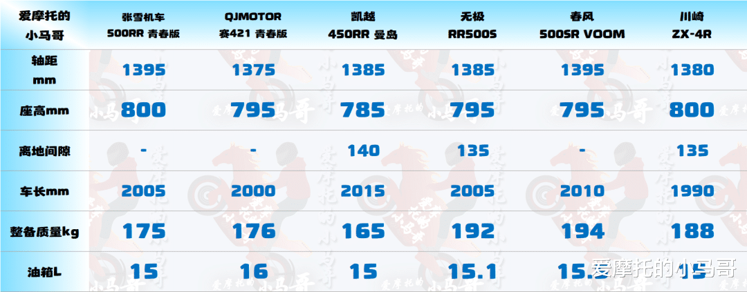 其实单看轴距、座高以及油箱这些数据,这六款车型没啥太大的差别,但整备质量差异化却蛮大的。