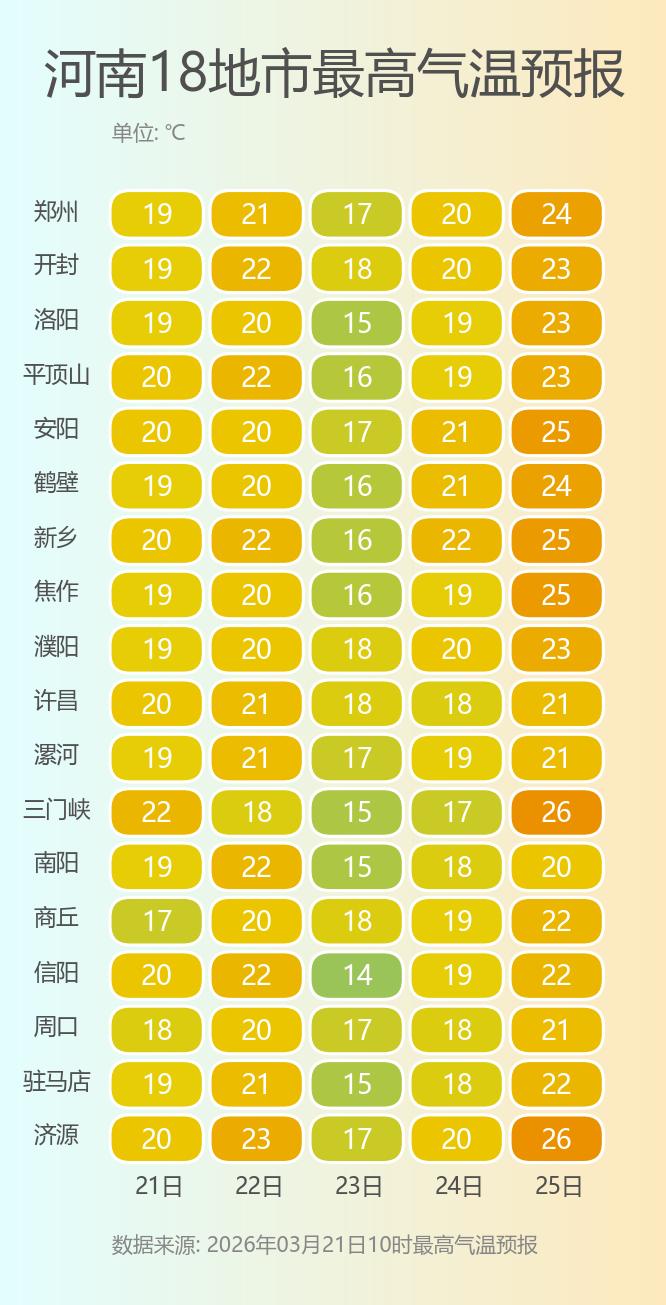 周末阳光开场,暖意上线!预计今天全省大部最高气温接近20℃,暖意十足。明天气温继续攀升,将迎来近期高点,多地午后气温超20℃,春日氛围感拉满。下周一气温虽有小幅下滑,但升温依旧是天气主旋律,预计25日全省多地最高气温再度重回20℃以上,西部、北部部分地区甚至将冲击25度。