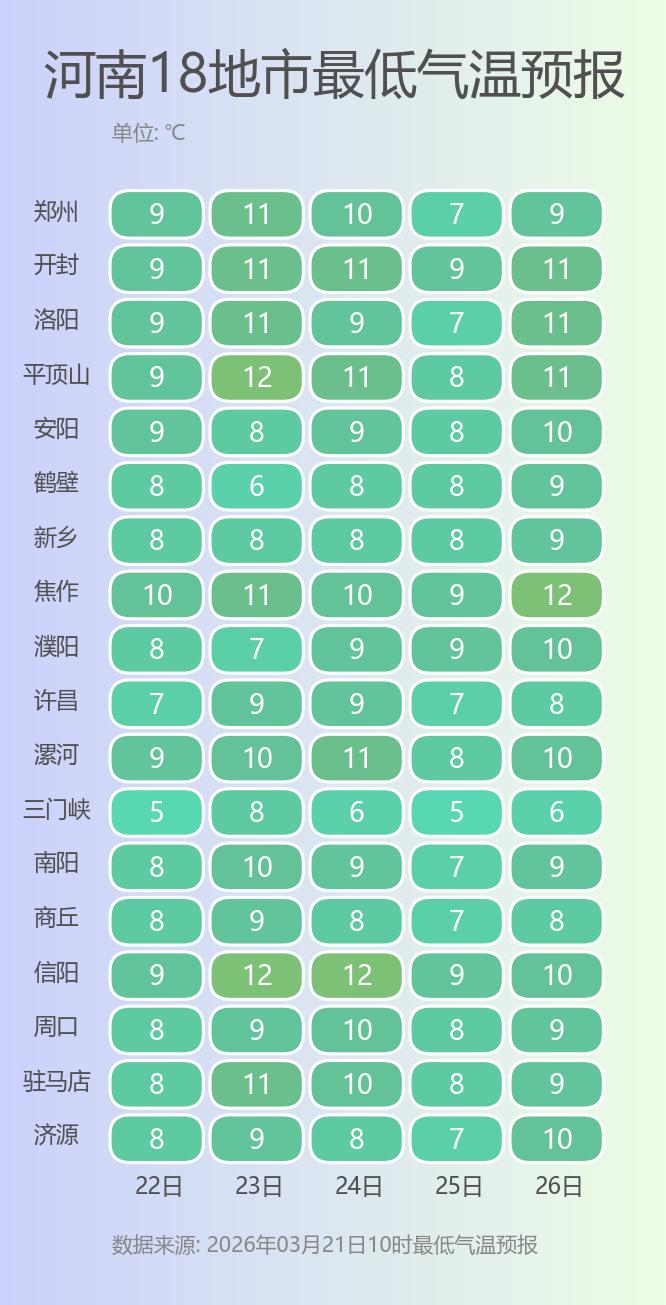 预计未来五天最低气温多维持在10℃左右,大部地区昼夜温差达10℃~13℃,提醒大家采用洋葱穿衣法,根据气温变化灵活增减衣物。