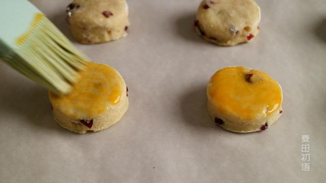 把司康面团放入烤盘中,要保持一定的间隔。依次刷上蛋黄液,只刷顶部就可以了。送入烤箱中下层,调整上火190度下火180度,时长为20分钟,要根据你的烤箱温差灵活调整。