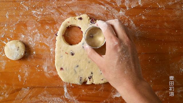 用擀面杖将面团擀压成厚1.5cm左右的片状,用直径为4.5cm的金属圈压出圆形面团,压之前先在内侧涂一些干粉防粘。如果没有模具就直接用刀切成小块,注意控制好面团的面积和厚度,否则烘烤时顶部会开裂,虽不影响口感,但影响了颜值。