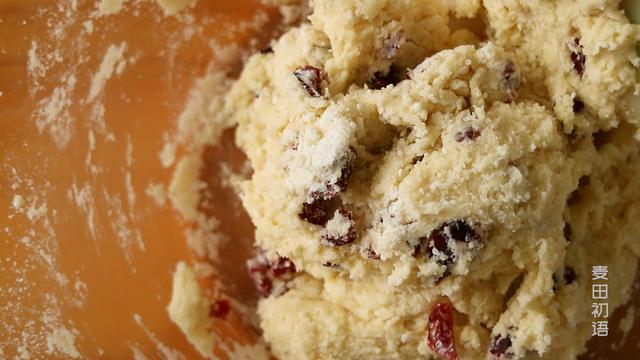 蔓越莓味:低筋面粉160克,细砂糖25克,食盐1克,泡打粉4克,无盐黄油40克,牛奶40克,全蛋液40克,蔓越莓干30克
