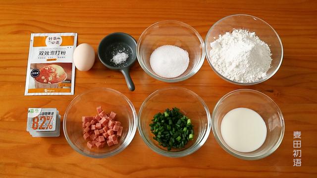 香葱火腿味:低筋面粉160克,细砂糖20克,食盐2克,泡打粉4克,无盐黄油40克,牛奶40克,全蛋液40克,火腿肠30克,香葱8克