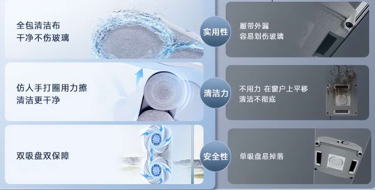 不是所有玻璃都能擦。先确认家里玻璃厚度(大部分机型支持 3-25mm,适配常见的单层、双层中空玻璃),再看是否能擦无框玻璃(需要机器边缘有防碰撞传感器),有阳台护栏或异形窗的,优先选机身薄(≤10cm)、转向灵活的机型。