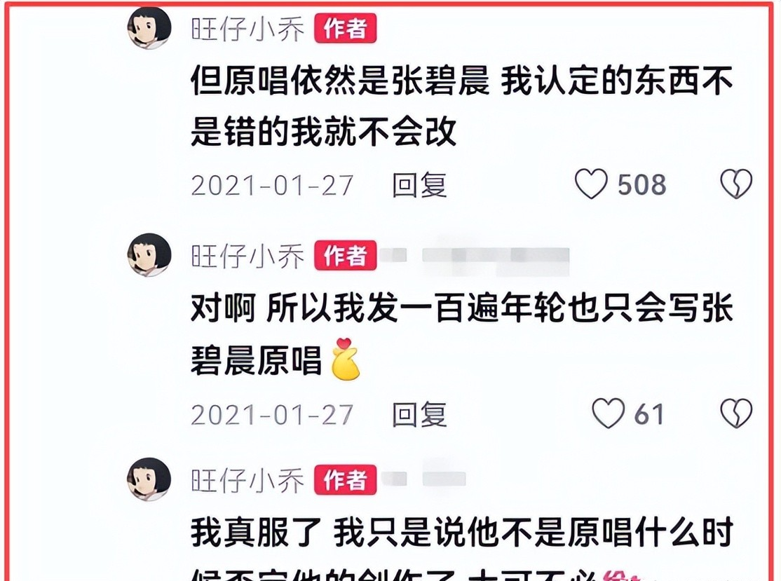 7月25日,“旺仔小乔”更是在自己的评论区带头拱火:“发一百遍也只会写张碧晨是原唱。”