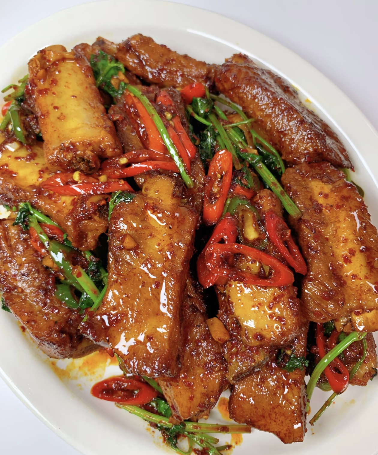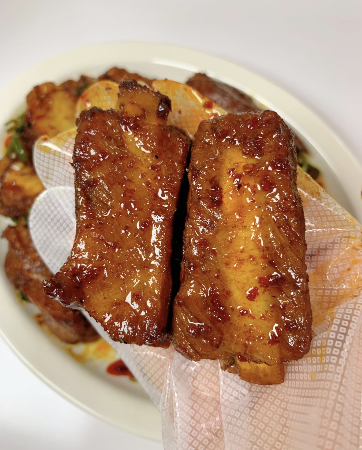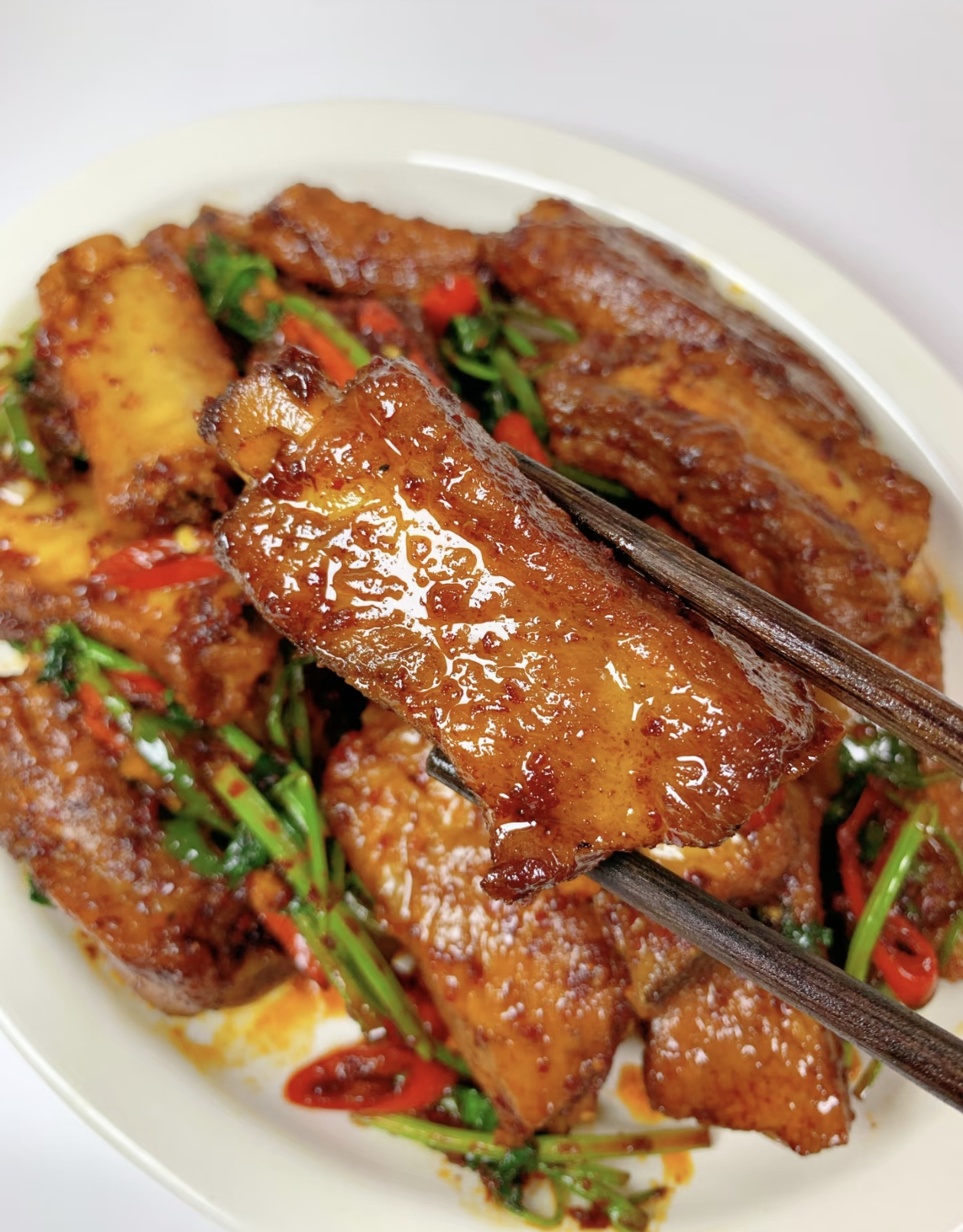 出锅的那一刻,香味直接飘满整个屋子,红亮的酱汁裹着排骨,青红椒和香菜点缀其间,光是看着就让人直咽口水。夹一块放进嘴里,排骨的肉香、辣椒的鲜辣、香料的醇厚在嘴里层层递进,肉质软烂却不松散,连骨头都想嗦得干干净净,配着米饭能连吃三碗都不腻。