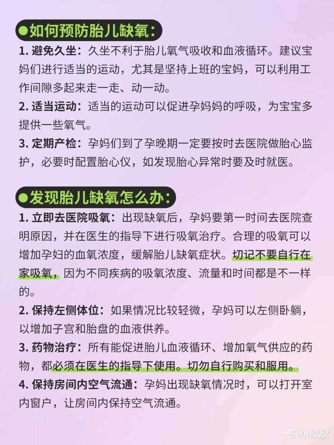 孕妇自身的一些变化也可能提示胎儿缺氧:妊娠期高血压会减少胎盘血流,导致胎儿缺氧;孕晚期体重连续几周不增长,可能提示胎儿生长受限;孕妇自身缺氧,如贫血、心肺疾病,会间接影响胎儿供氧。若发现胎儿缺氧信号,需立即采取以下措施:左侧卧位,减轻子宫对下腔静脉压迫,增加胎盘血流量; 在医生指导下吸氧,提高母体血氧含量;紧急就医,携带产检资料,选择有新生儿抢救能力的医院。;若缺氧严重且无法缓解,需紧急剖宫产。预防建议在孕28周后每天数胎动,定期胎心监护;控制血压、血糖,预防妊娠期并发症;避免长时间仰卧,保持左侧卧位休息;保持心情舒畅,避免焦虑情绪影响胎盘血流。
