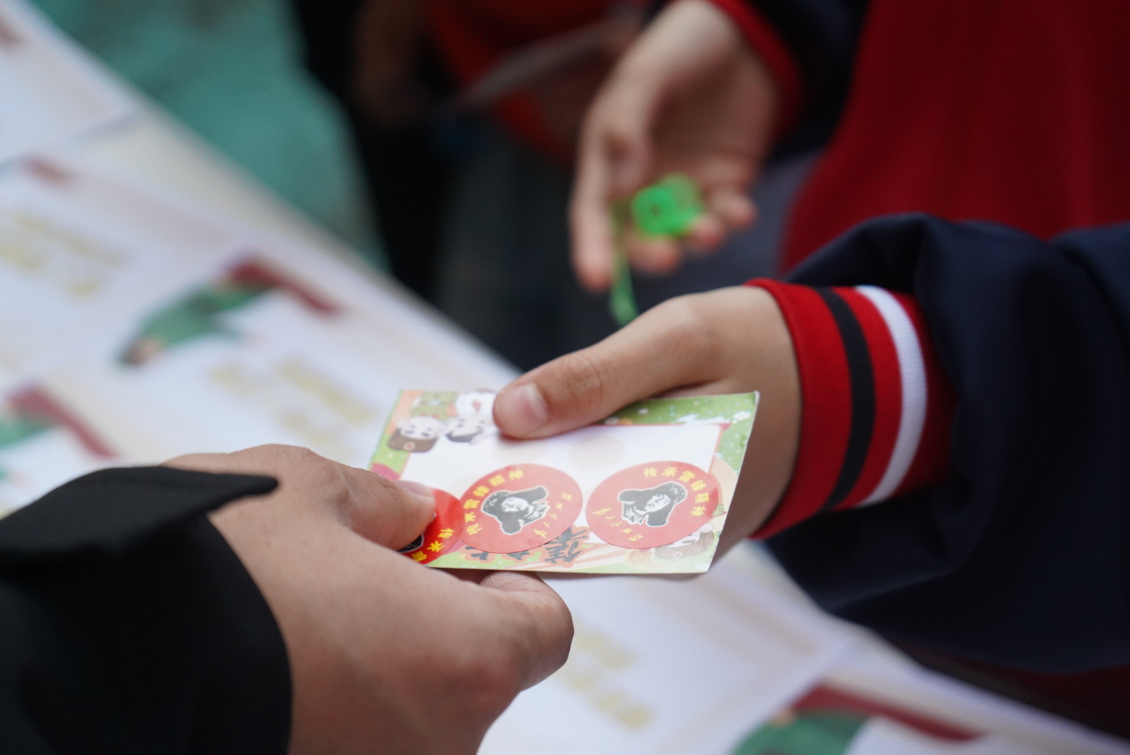 游戏启智,笑语传情。沾雷锋精神、赶马促进步、与雷锋跨时代对话……在游戏互动区,志愿者们精心设计了多个寓教于乐的环节。孩子们用玩具小手粘取印有雷锋语录的卡片,大声诵读标语;用扇子扇动气球,在欢笑中体验“追赶进步”的乐趣;在雷锋主题海报上描绘手掌印记,写下想对雷锋叔叔说的话。游戏不仅激发了孩子们的参与热情,更让助人为乐、勤俭节约的雷锋精神在互动中悄然扎根。