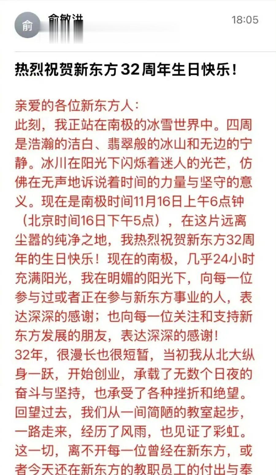“冰川在阳光下闪烁着迷人的光芒,仿佛在无声地诉说着时间的力量与坚守的意义。”俞敏洪以南极的阳光与洁净比喻新东方多年来的不易,对“每一个‘你’的默默耕耘”表达了感谢,称新东方人就像冰雪中的企鹅一般互相扶持。